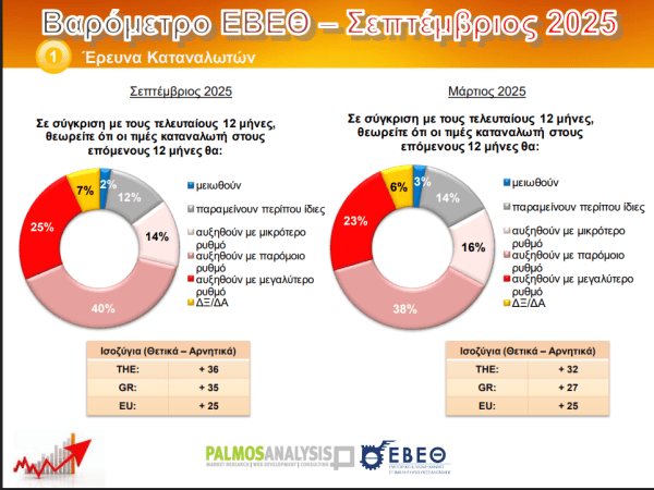 Συγκεκριμένα, ο δείκτης πρόβλεψης για την εξέλιξη των τιμών το επόμενο 12μηνο επανήλθε στο +36, υποδηλώνοντας ότι τα νοικοκυριά εξακολουθούν να αναμένουν αυξήσεις.