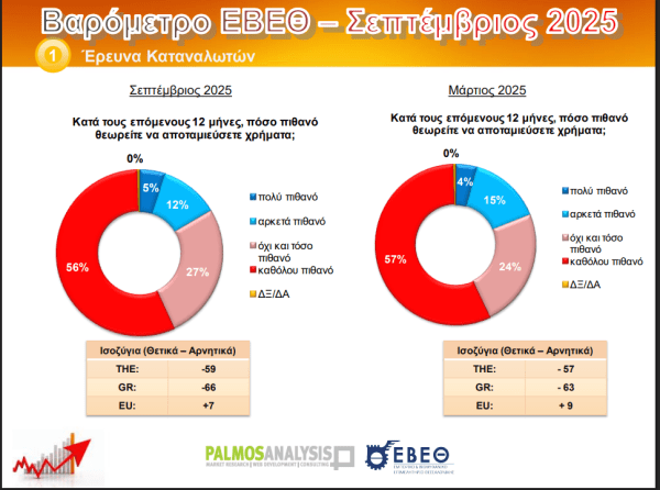 Επιπλέον, ένα σημαντικό ποσοστό 56% δεν θεωρεί καθόλου πιθανό ότι το επόμενο διάστημα θα αποταμιεύσει χρήματα και ένα 27% όχι και τόσο πιθανό.
