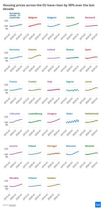 Από το 2010 έως το δεύτερο τρίμηνο του 2025, τα ενοίκια αυξήθηκαν σχεδόν κατά 29% και οι τιμές κατοικιών πάνω από 60% στην ΕΕ. Οι πολίτες νιώθουν ασφυκτική πίεση, κάτι που προκάλεσε έντονες διαμαρτυρίες πολιτών από τη Λισαβόνα μέχρι τη Βαρκελώνη και την Κοπεγχάγη.