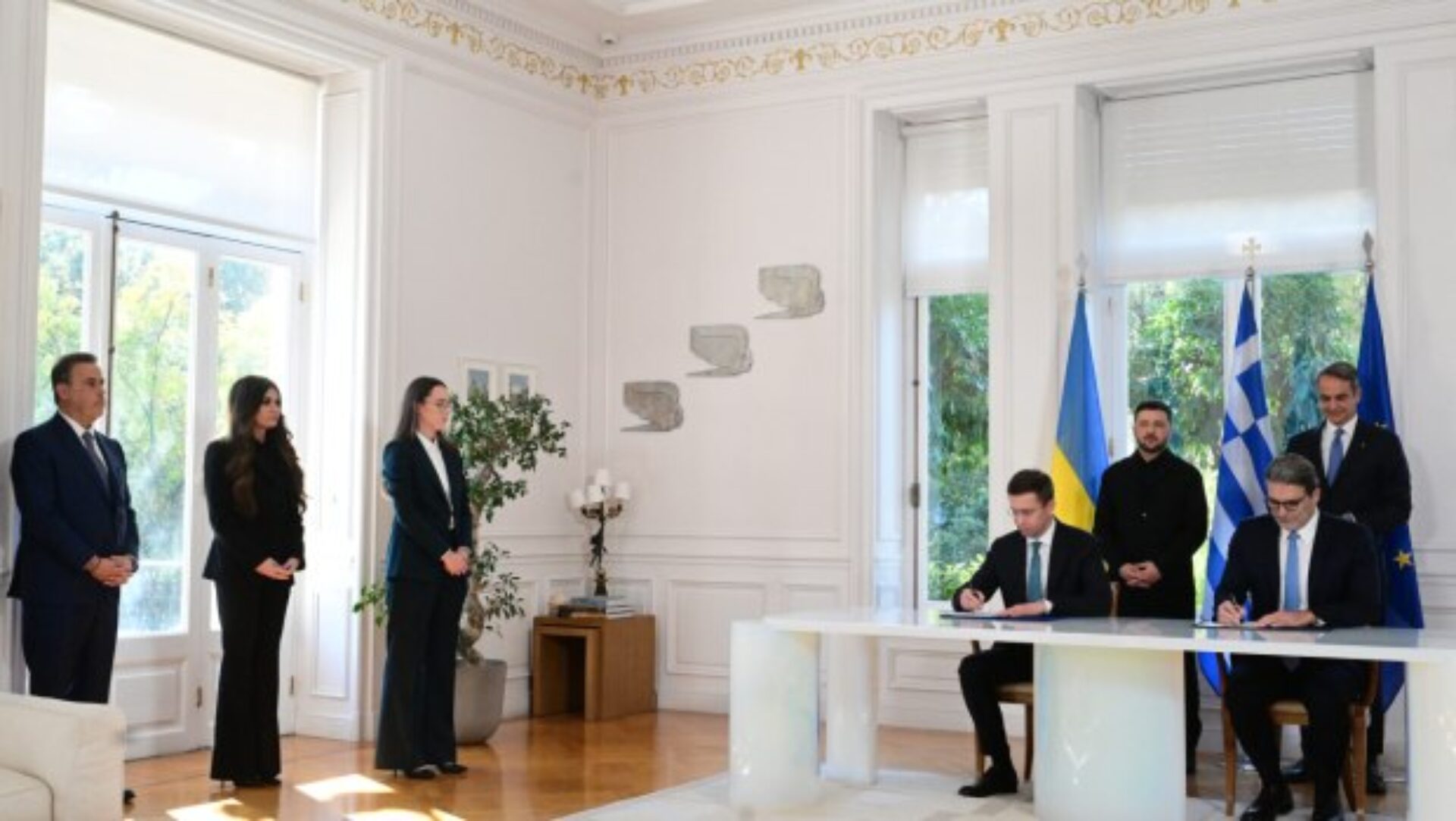 Η υπογραφή της συμφωνίας έγινε παρουσία του Κυριάκου Μητσοτάκη, του Βολοντίμιρ Ζελένσκι και της Κίμπερλι Γκίλφοϊλ, στο Μέγαρο Μαξίμου.