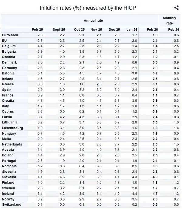 Στην Ευρωπαϊκή Ένωση, ο ετήσιος πληθωρισμός ανήλθε σε 2,1% τον Φεβρουάριο του 2026, από 2% τον Ιανουάριο. Ένα χρόνο νωρίτερα, το ποσοστό ήταν 2,7%.