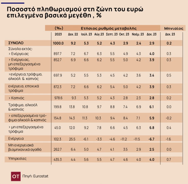 Ένα χρόνο νωρίτερα, ο ποσοστό ήταν 9,2%. Ο ετήσιος πληθωρισμός της Ευρωπαϊκής Ένωσης ήταν 3,4% τον Δεκέμβριο του 2023, από 3,1% τον Νοέμβριο. Ένα χρόνο νωρίτερα, το ποσοστό ήταν 10,4%.