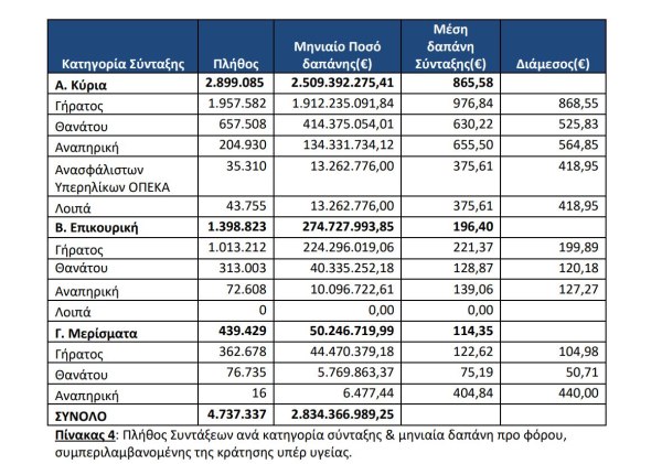 Τον Ιανουάριο πληρώθηκαν 2.899.085 κύριες συντάξεις, με συνολική δαπάνη σχεδόν 2,51 δισ. ευρώ και μέση δαπάνη ανά κύρια σύνταξη 865,58 ευρώ.