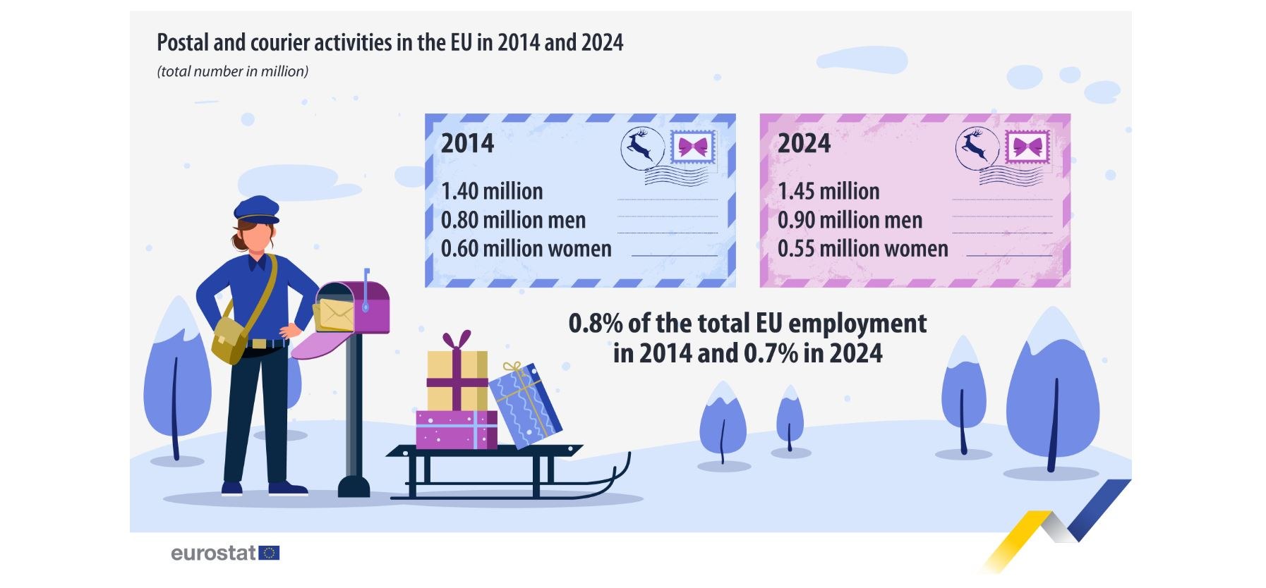 Στην ΕΕ, 1,45 εκατομμύρια άτομα ηλικίας 15 ετών και άνω απασχολούνταν στις ταχυδρομικές και ταχυμεταφορικές υπηρεσίες το 2024, σε σύγκριση με 1,4 εκατομμύρια το 2014. Οι ταχυδρομικές και ταχυμεταφορικές δραστηριότητες περιλαμβάνουν υπηρεσίες όπως η παραλαβή, η μεταφορά και η παράδοση επιστολών και δεμάτων.