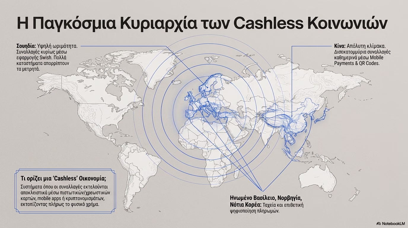 Η Σουηδία θεωρείται από τις πιο προηγμένες κοινωνίες χωρίς μετρητά. Πολλά καταστήματα δεν δέχονται φυσικό χρήμα, και οι συναλλαγές γίνονται κυρίως μέσω καρτών ή της εφαρμογής Swish. Η Κίνα έχει ευρεία χρήση τον λεγόμενον mobile payments, με δισεκατομμύρια συναλλαγές μέσω QR codes. Άλλες χώρες όπως η Νότια Κορέα, η Νορβηγία και το Ηνωμένο Βασίλειο προχωρούν γρήγορα προς την ψηφιοποίηση των πληρωμών.