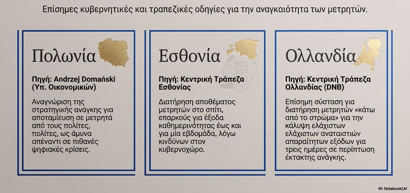 Κεντρικές τράπεζες και ευρωπαϊκές κυβερνήσεις συμβουλεύουν τους πολίτες να διατηρούν ένα απόθεμα φυσικών χρημάτων για περιπτώσεις εκτάκτων αναγκών