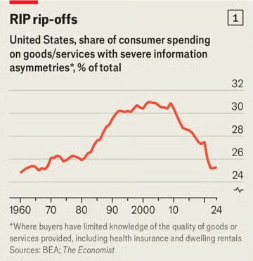 Κατά τον Economist, αυτά τα παραδείγματα συνθέτουν κάτι μεγαλύτερο: Καθώς η Τεχνητή Νοημοσύνη γίνεται mainstream, θα εξαλείψει μια από τις πιο κλασικές στρεβλώσεις στον σύγχρονο καπιταλισμό: τα πλεονεκτήματα πληροφόρησης που απολαμβάνουν οι πωλητές, οι πάροχοι υπηρεσιών και οι μεσάζοντες έναντι των καταναλωτών. Όταν όλοι έχουν μιαν ιδιοφυΐα στην τσέπη τους, θα είναι λιγότερο ευάλωτοι σε παραπλανητικές πωλήσεις – ωφελώντας τους και βελτιώνοντας τη συνολική οικονομική αποδοτικότητα. Η «οικονομία της απάτης», στης οποίας το πλαίσιο οι εταιρείες επωφελούνται από την αδιαφάνεια, τη σύγχυση ή την αδράνεια, βρίσκει τον αντίπαλό της.