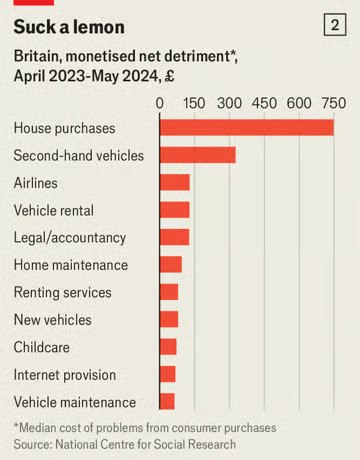 Μια μελέτη που ανατέθηκε από την κυβέρνηση στη Βρετανία το 2024 εκτίμησε ότι οι πολίτες έχασαν το ισοδύναμο του 2,5% του ΑΕΠ ετησίως ως αποτέλεσμα της αγοράς αγαθών και υπηρεσιών που ήταν πολύ κακής ποιότητας ή έπασχαν από άλλα ελαττώματα. Αυτό περιλάμβανε τα πάντα: από την ανάγκη επαναγοράς μιας διαφορετικής έκδοσης του ίδιου προϊόντος μέχρι τον χρόνο που σπαταλήθηκε σε παράπονα. Παρά τις βελτιώσεις από τότε που ο κ. Άκερλοφ έγραφε για τα «σαπάκια», η αγορά μεταχειρισμένων αυτοκινήτων εξακολουθεί να είναι δύσκολη: