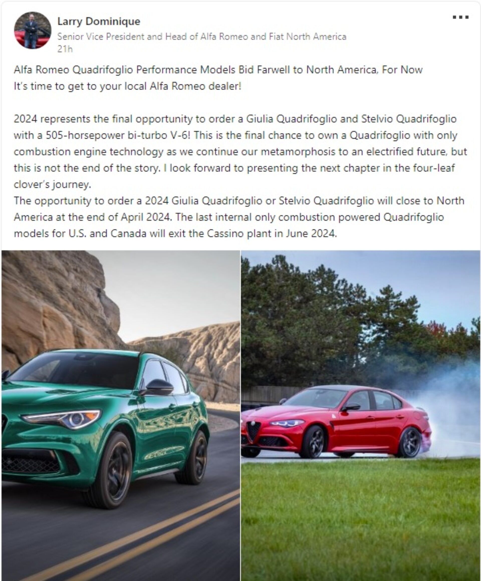 bi-turbo V-6,” said Larry Dominique, SVP Head of Alfa Romeo North