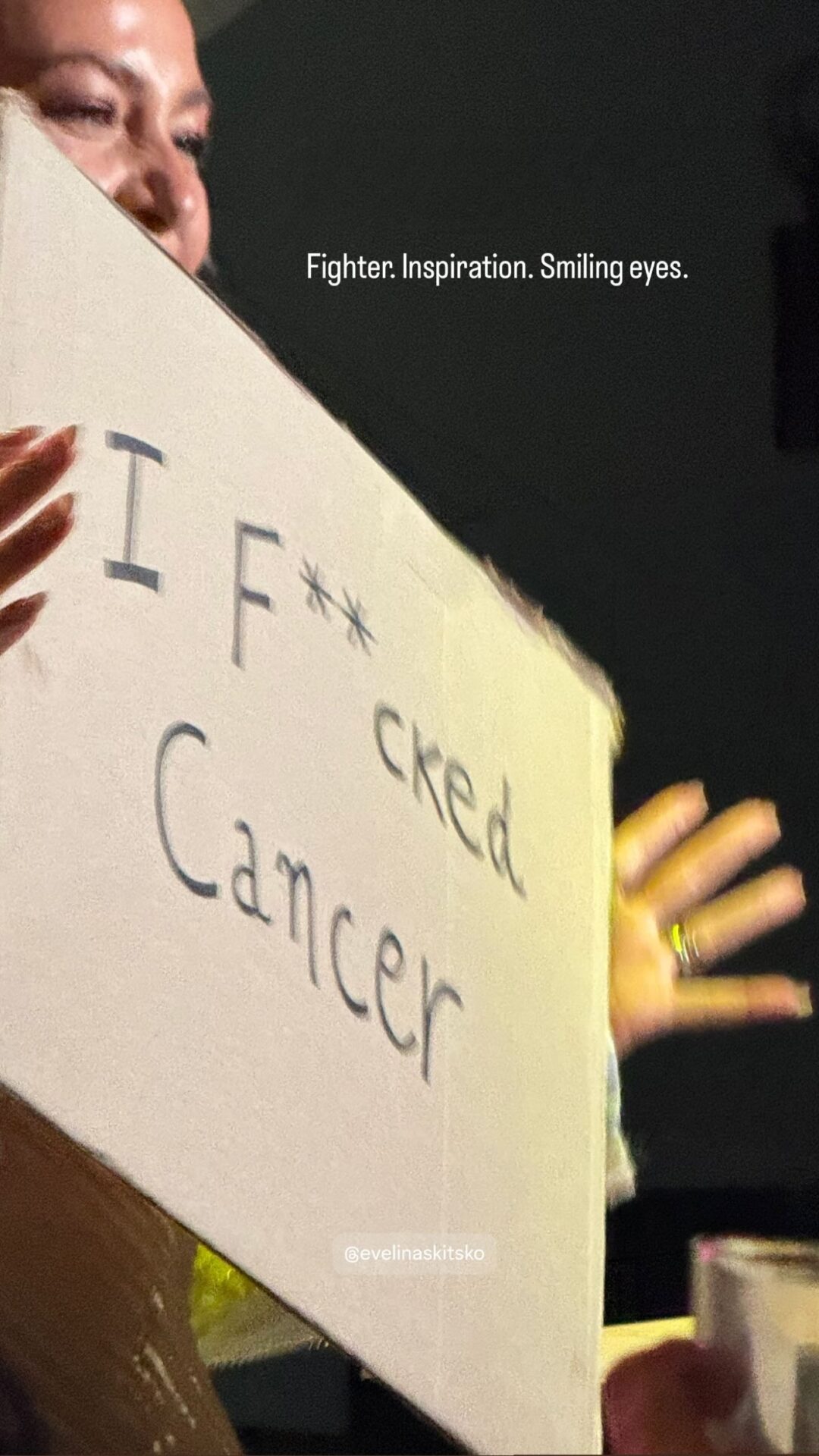 Το 27χρονο μοντέλο γιόρτασε τη νίκη της με χιούμορ και αισιοδοξία, κρατώντας μία πινακίδα με μήνυμα στα αγγλικά που στέλνει κουράγιο σε όσους δίνουν παρόμοιες μάχες.