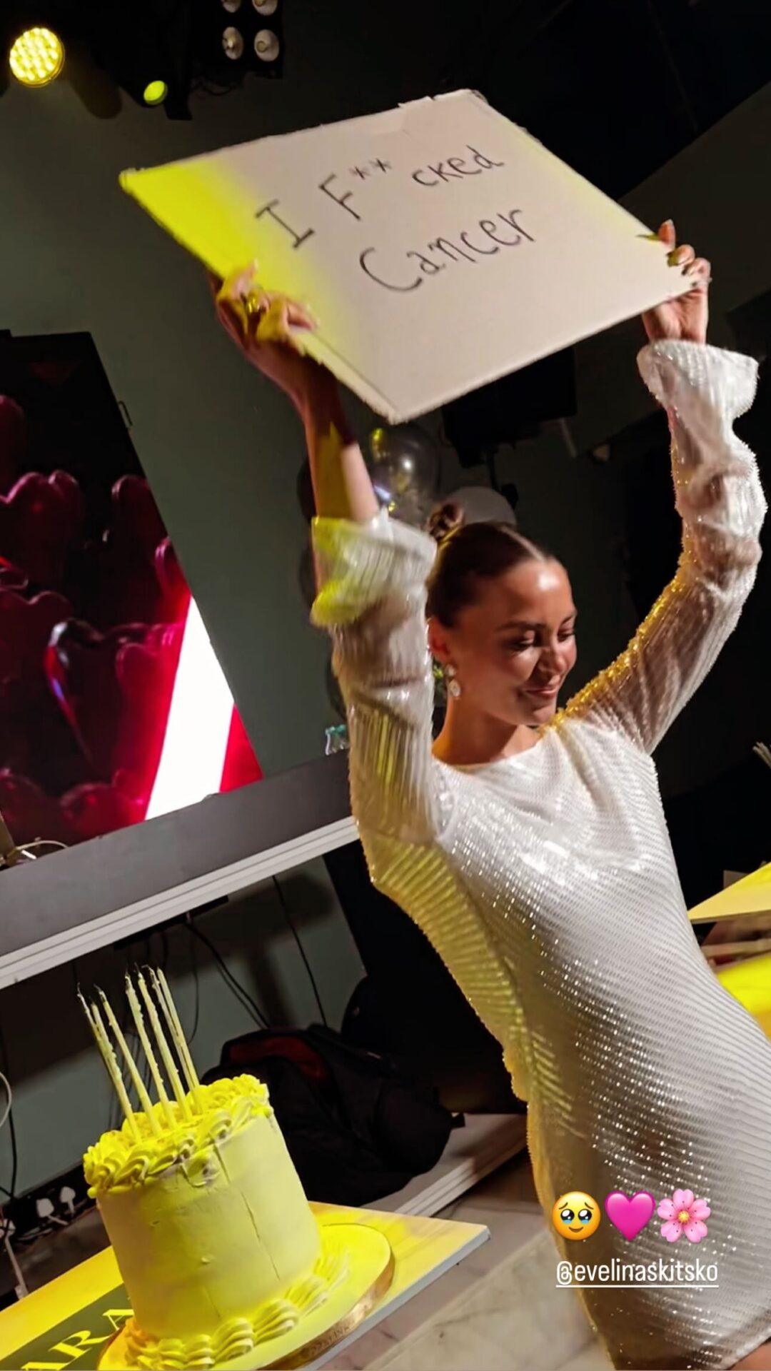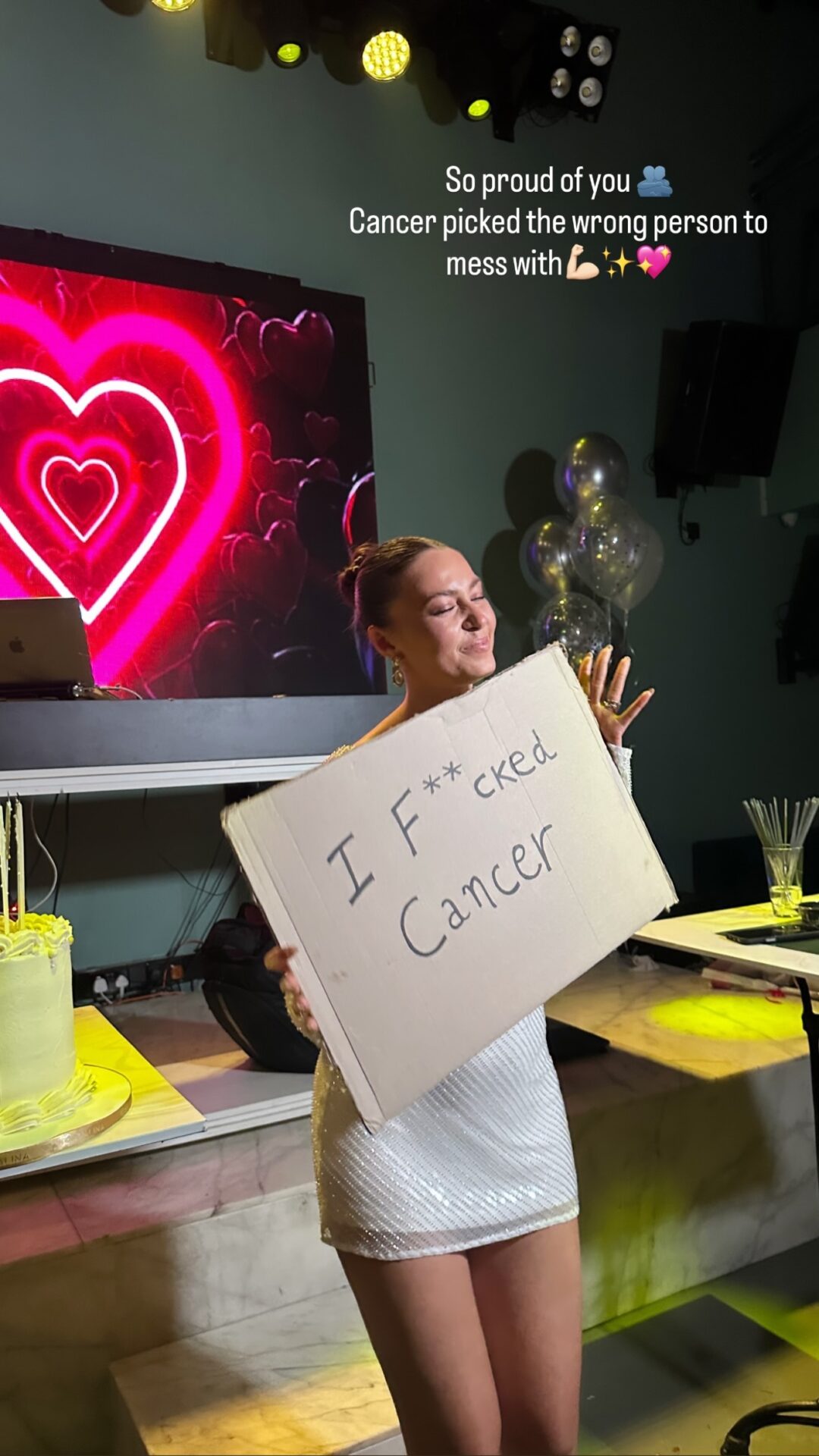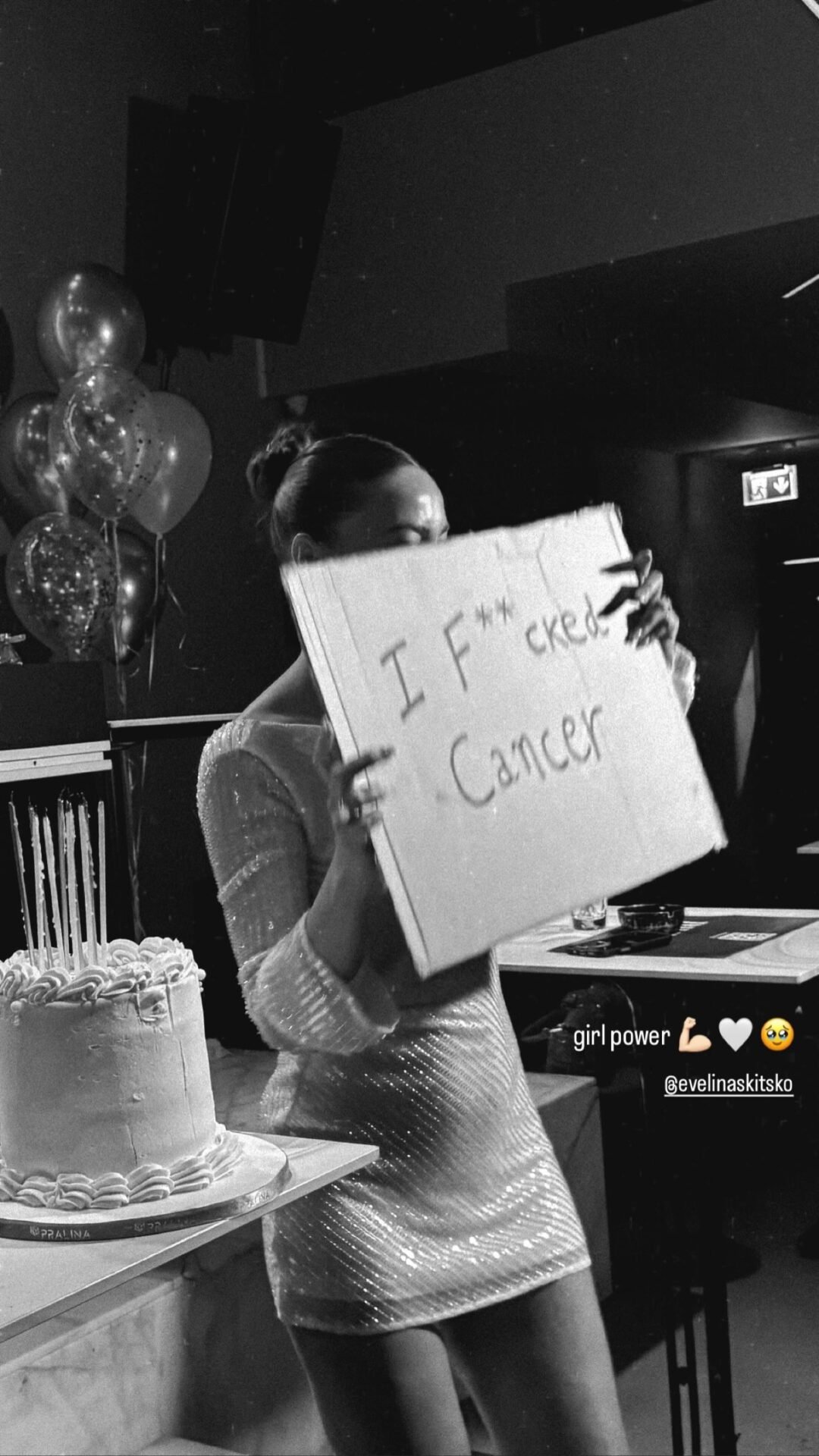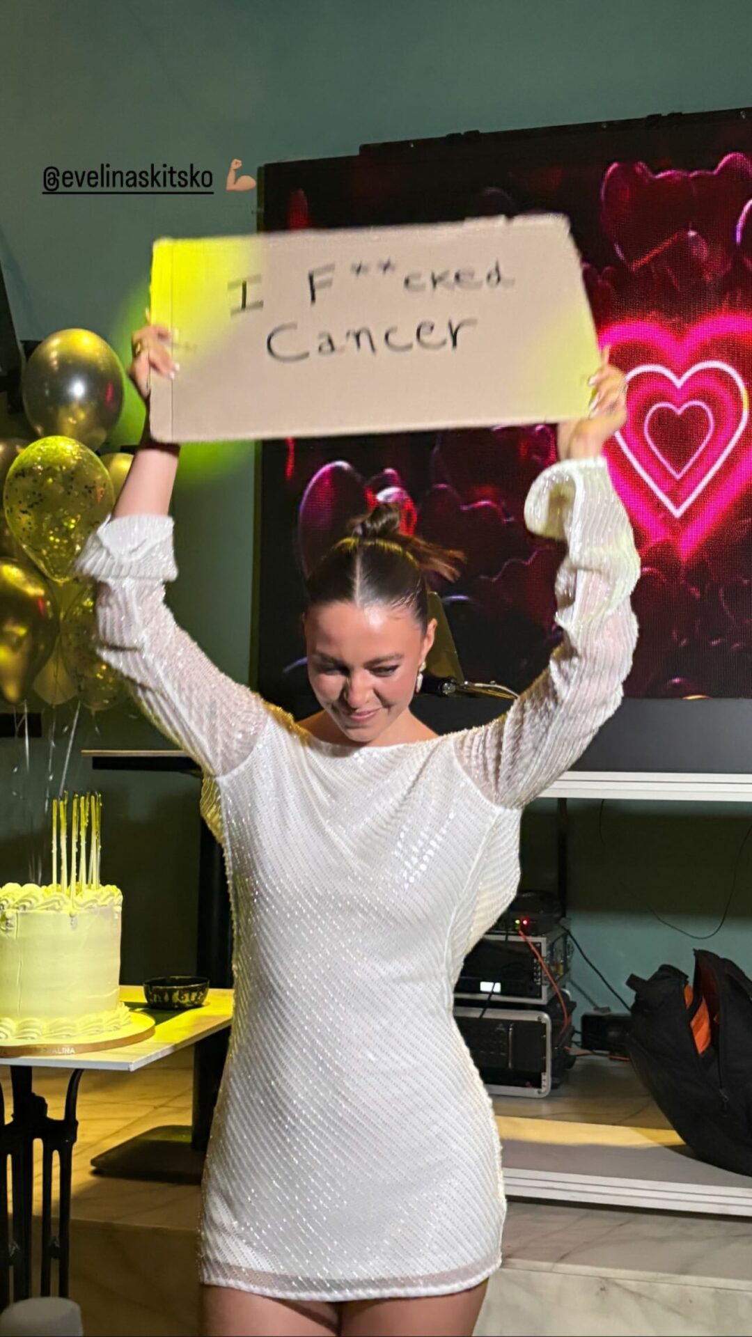 Το 27χρονο μοντέλο γιόρτασε τη νίκη της με χιούμορ και αισιοδοξία, κρατώντας μία πινακίδα με μήνυμα στα αγγλικά που στέλνει κουράγιο σε όσους δίνουν παρόμοιες μάχες.