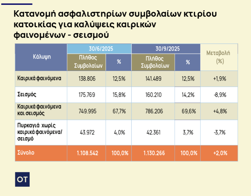 Ιδιαίτερη δυναμική παρουσιάζουν οι ασφαλίσεις κατοικιών που καλύπτουν κινδύνους από καιρικά φαινόμενα και σεισμό, οι οποίες εμπίπτουν στις προϋποθέσεις για την έκπτωση του ΕΝΦΙΑ. Οι συγκεκριμένες καλύψεις αυξήθηκαν κατά 4,8% σε σχέση με την προηγούμενη έρευνα, ανεβάζοντας τη συμμετοχή τους στο σύνολο των ασφαλιστηρίων με κάλυψη κτιρίου στο 69,6%, από 67,7% τον Ιούνιο του 2025.
