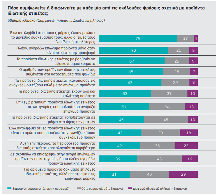 Ωστόσο, ένα σημαντικό ποσοστό (31%), δοκίμασαν τα προϊόντα ιδιωτικής ετικέτας, αλλά επέστρεψαν στα brands, εξισορροπώντας εν μέρει τη μετατόπιση αυτή.