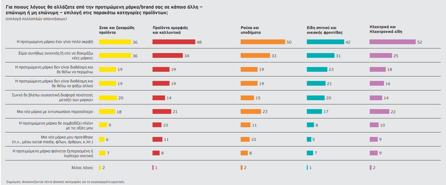 Παρά τις προσπάθειες αυτές, η πιστότητα προς τις επώνυμες μάρκες παραμένει ευάλωτη: επτά στους δέκα καταναλωτές δηλώνουν ότι αγοράζουν επώνυμα προϊόντα μόνο σε προσφορά (70%), ενώ 39% δεν σκοπεύουν να επιστρέψουν σε επώνυμες επιλογές σε κατηγορίες όπου πλέον αγοράζουν προϊόντα ιδιωτικής ετικέτας.