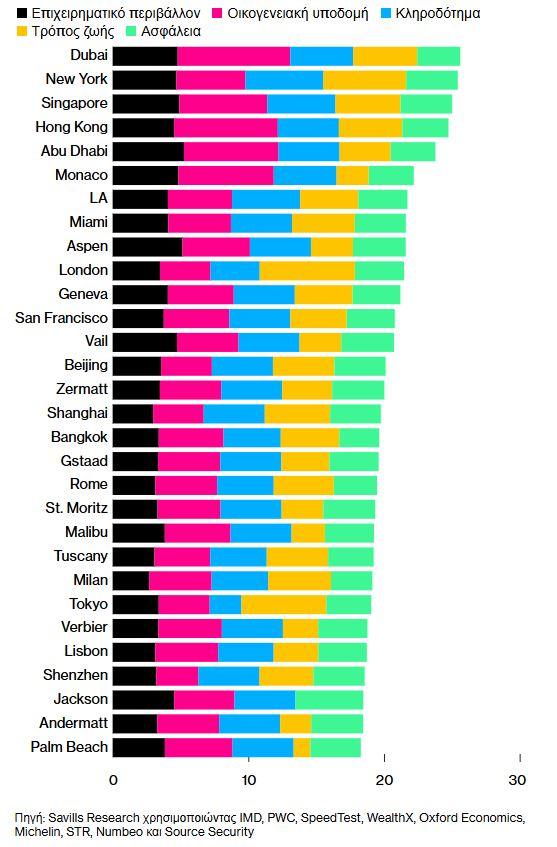 Εν τω μεταξύ, το επιχειρηματικό περιβάλλον έχει καταστεί κρίσιμος παράγοντας για την απόφαση σχετικά με τον επόμενο προορισμό. Το Ντουμπάι και η Νέα Υόρκη — οι δύο πρώτες πόλεις στην κατάταξη της Savills — έχουν προσελκύσει πλούσιους ιδιώτες χάρη στο φιλικό προς τις επιχειρήσεις περιβάλλον, τα φορολογικά πλεονεκτήματα και τη γεωπολιτική σταθερότητα, σύμφωνα με την έκθεση.