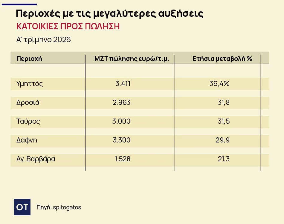 Οι περιοχές που ξεχώρισαν κατά το 1ο τρίμηνο του 2026 για τις σημαντικές αυξήσεις που σημείωσαν στη ΜΖΤ πώλησης κατοικίας σε σχέση με το αντίστοιχο τρίμηνο του 2025 είναι η περιοχή του Υμηττού, ενώ ακολουθούν η Δροσιά, ο Ταύρος, η Δάφνη και η Αγία Βαρβάρα.