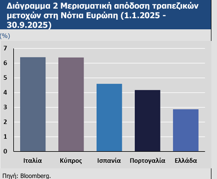Όπως εξηγει η ΤτΕ, οι μετοχές των τραπεζών στη Νότια Ευρώπη (Ελλάδα, Ιταλία, Κύπρος) σημείωσαν εντυπωσιακή άνοδο. Ο βασικός λόγος για την άνοδο των τραπεζικών μετοχών είναι η ενίσχυση της κερδοφορίας τους, που προήλθε από την αύξηση των εσόδων από τόκους, τη βελτιωμένη διαχείριση κόστους και την διαφοροποίηση των πηγών εσόδων.