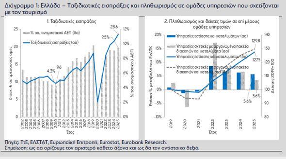 Tο 2025 αποτέλεσε νέο έτος ρεκόρ για τον ελληνικό τουρισμό, με την άμεση, την έμμεση και την επαγόμενη συνεισφορά του κλάδου στην οικονομία να είναι πολύ σημαντική σε όρους εισοδήματος, απασχόλησης και αντιστάθμισης (μερικής) του εμπορικού ελλείμματος. Αυτό επισημαίνεται σε ανάλυση της Eurobank στο εβδομαδιαίο δελτίο της για την ελληνική οικονομία.