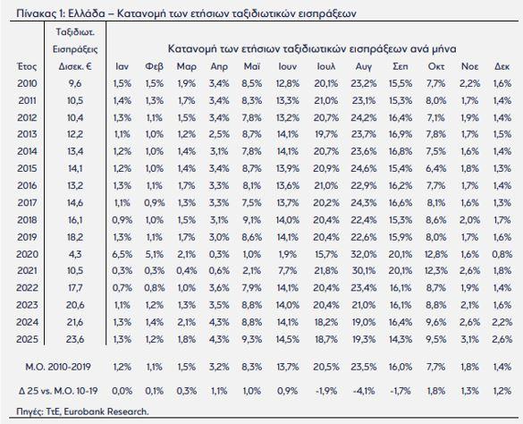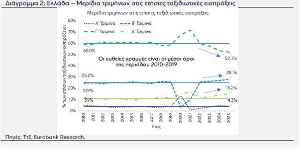 Αυτή η εξέλιξη αναδεικνύει τη σημασία της ποιοτικής αναβάθμισης του τουριστικού προϊόντος και της ενίσχυσης της προστιθέμενης αξίας ανά επισκέπτη Τέλος, η τάση μετά την πανδημία της διεύρυνσης της κατανομής των ταξιδιωτικών εισπράξεων στη διάρκεια του έτους (θετική εξέλιξη) συνεχίστηκε το 2025, με τη βαρύτητα του γ’ τριμήνου να μειώνεται και του β’ και του δ’ τριμήνου να αυξάνεται. Η ενίσχυση της πραγματικής δαπάνης ανά ταξιδιώτη και η διεύρυνση της τουριστικής σεζόν αποτελούν σημαντικούς παράγοντες για τη βιωσιμότητα του ελληνικού τουρισμού.