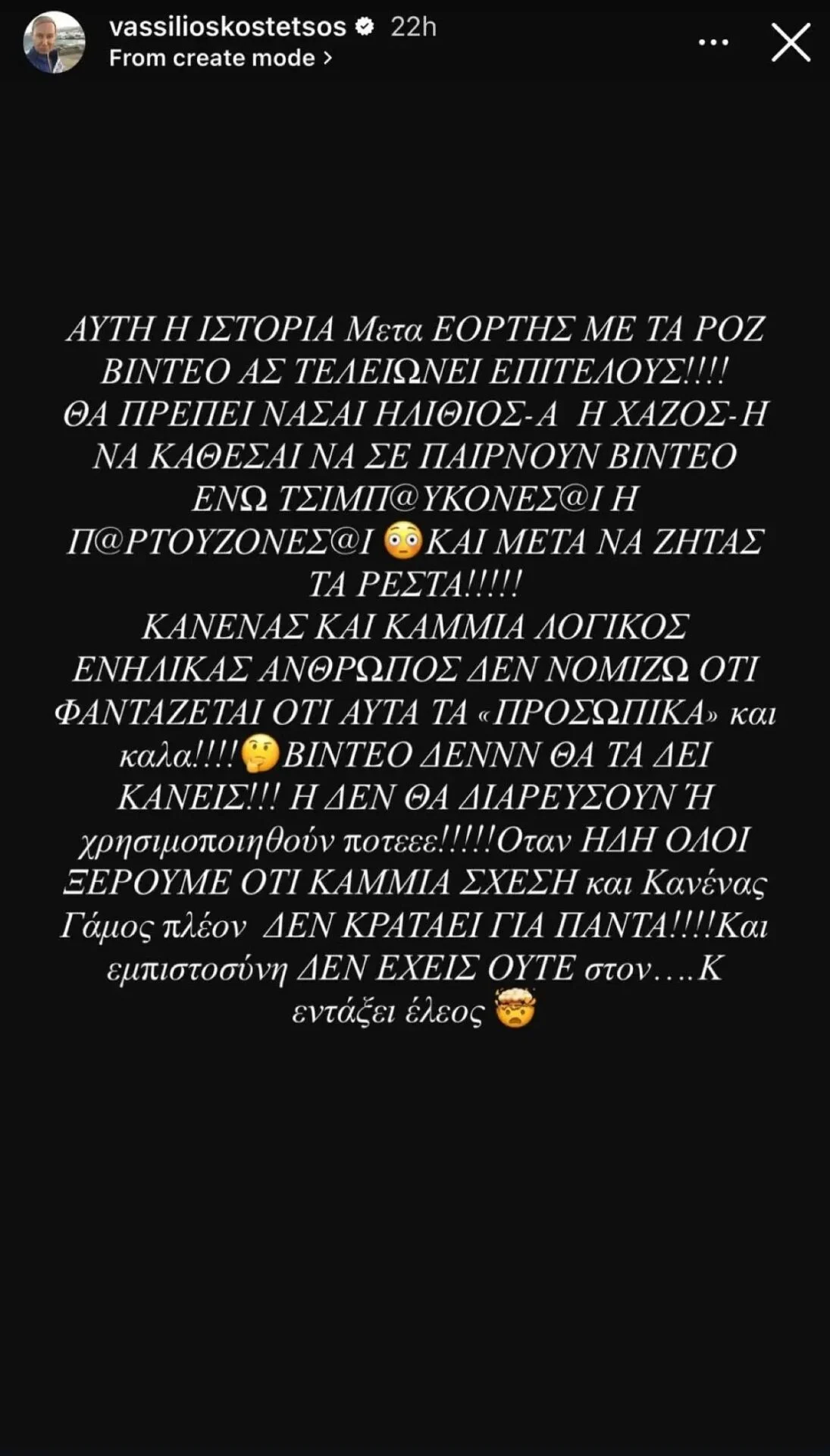 «Αυτή η ιστορία μετά εορτής με τα ροζ βίντεο ας τελειώσει επιτέλους! Θα πρέπει να είσαι ηλίθιος ή χαζός – χαζή να κάθεσαι να σε παίρνουν βίντεο ενώ τσιμπ@ύκον@σαι ή πα@τουζον@σαι και μετά να ζητάς τα ρέστα! Κανένας και καμία λογικός ενήλικας άνθρωπος δεν νομίζω ότι φαντάζεται πως αυτά τα “προσωπικά” και καλά βίντεο δεν θα τα δει κανείς ή δεν θα διαρρεύσουν ή δεν θα χρησιμοποιηθούν ποτέ! Όταν ήδη όλοι ξέρουμε ότι καμία σχέση και κανένας γάμος πλέον δεν κρατάει για πάντα! Και εμπιστοσύνη δεν έχεις ούτε στον… Κ, εντάξει έλεος!», έγραψε χαρακτηριστικά ο γνωστός σχεδιαστής.