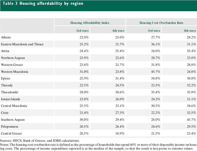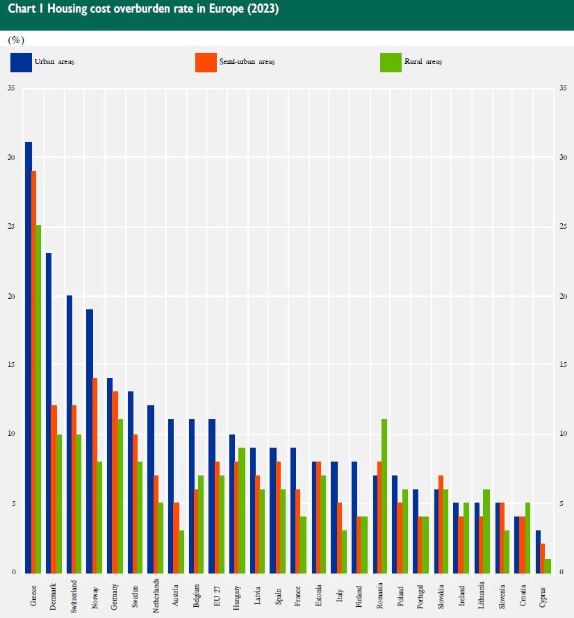 Η στέγαση κοστίζει πιο ακριβά στην Ελλάδα από κάθε άλλη χώρα της ΕΕ, αναλογικά με το εισόδημα των κατοίκων της. Η χώρα μας βρίσκεται στον πάτο της κατάταξης στο ζήτημα της προσιτότητας στέγασης μεταξύ των κρατών-μελών της Ευρωπαϊκής Ένωσης, σύμφωνα με πρόσφατη μελέτη της Τράπεζας της Ελλάδος. μεταξύ των κρατών-μελών της Ευρωπαϊκής Ένωσης, σύμφωνα με πρόσφατη μελέτη της Τράπεζας της Ελλάδος. Το 30,9% των ελληνικών νοικοκυριών δαπανά πάνω από το 40% του διαθέσιμου εισοδήματός του για στεγαστικό κόστος, ποσοστό που προσδίδει στην Ελλάδα μια ακόμη αρνητική πρωτιά. Η έρευνα πραγματοποιήθηκε από ομάδα ερευνητών του Ιδρύματος Οικονομικών και Βιομηχανικών Ερευνών και της Τράπεζας της Ελλάδος.