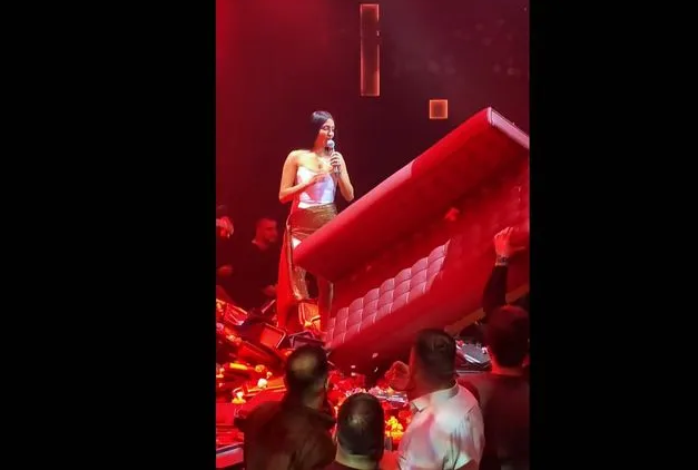 Την ώρα που η τραγουδίστρια ερμήνευε το “Κανείς εδώ δεν τραγουδά”κάποιος από το κοινό εκσφενδόνισε τον καναπέ προς τη σκηνή, προκαλώντας σοκ.