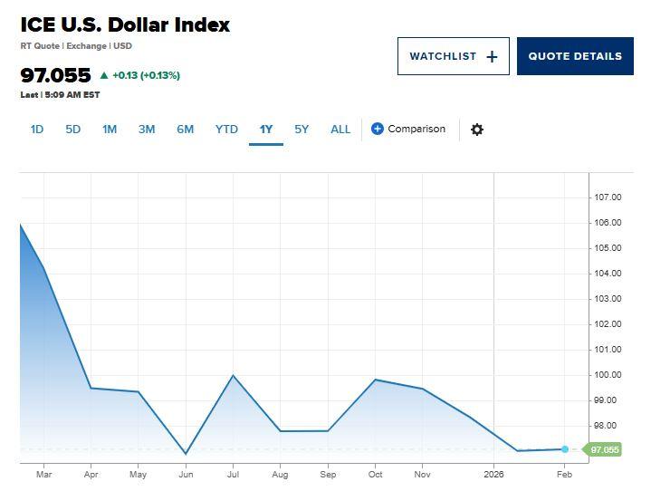 Ο δείκτης του δολαρίου ο οποίος παρακολουθεί την πορεία του δολαρίου έναντι ενός καλαθιού ομολόγων, έπεσε 1,3% στις 29 Ιανουαρίου, μετά τη δήλωση του Τραμπ ότι το δολάριο «τα πάει πολύ καλά», σημειώνοντας τη μεγαλύτερη πτώση σε μία ημέρα από τότε που ο Τραμπ ανακοίνωσε για πρώτη φορά τους δασμούς τον Απρίλιο. Το δολάριο έφτασε στο χαμηλότερο επίπεδό του σε σχεδόν τέσσερα χρόνια. Ο δείκτης έπεσε κατά 9,37% το 2025 και συνέχισε να πέφτει το 2026.