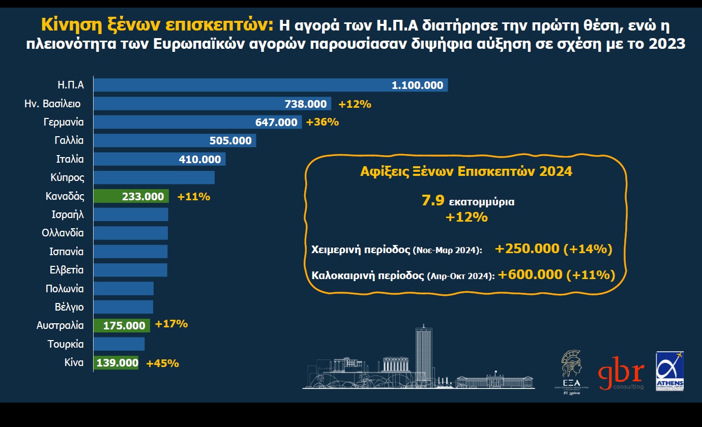 Σύμφωνα με την έρευνα η πλειονότητα των ευρωπαϊκών αγορών σημείωσε διψήφια αύξηση επισκεπτών στο ΔΑΑ. Παράλληλα, υπερπόντιοι προορισμοί / αγορές, όπως η Αυστραλία και η Κίνα, ανέκαμψαν με ταχείς ρυθμούς. Σε ό,τι αφορά τη διάρκεια της τουριστικής περιόδου, παρατηρήθηκε αυξημένη επισκεψιμότητα και κατά τους μήνες εκτός αιχμής. Ως προς την εξέλιξη της επιβατικής κίνησης το 2024, η Αθήνα κατατάσσεται πρώτη σε ευρωπαϊκό επίπεδο σε σχέση με το 2019, εμφανίζοντας ισχυρή αναπτυξιακή πορεία τη στιγμή που ο κλάδος των ευρωπαϊκών αεροδρομίων βρίσκεται ακόμα σε στάδιο ανάκαμψης.