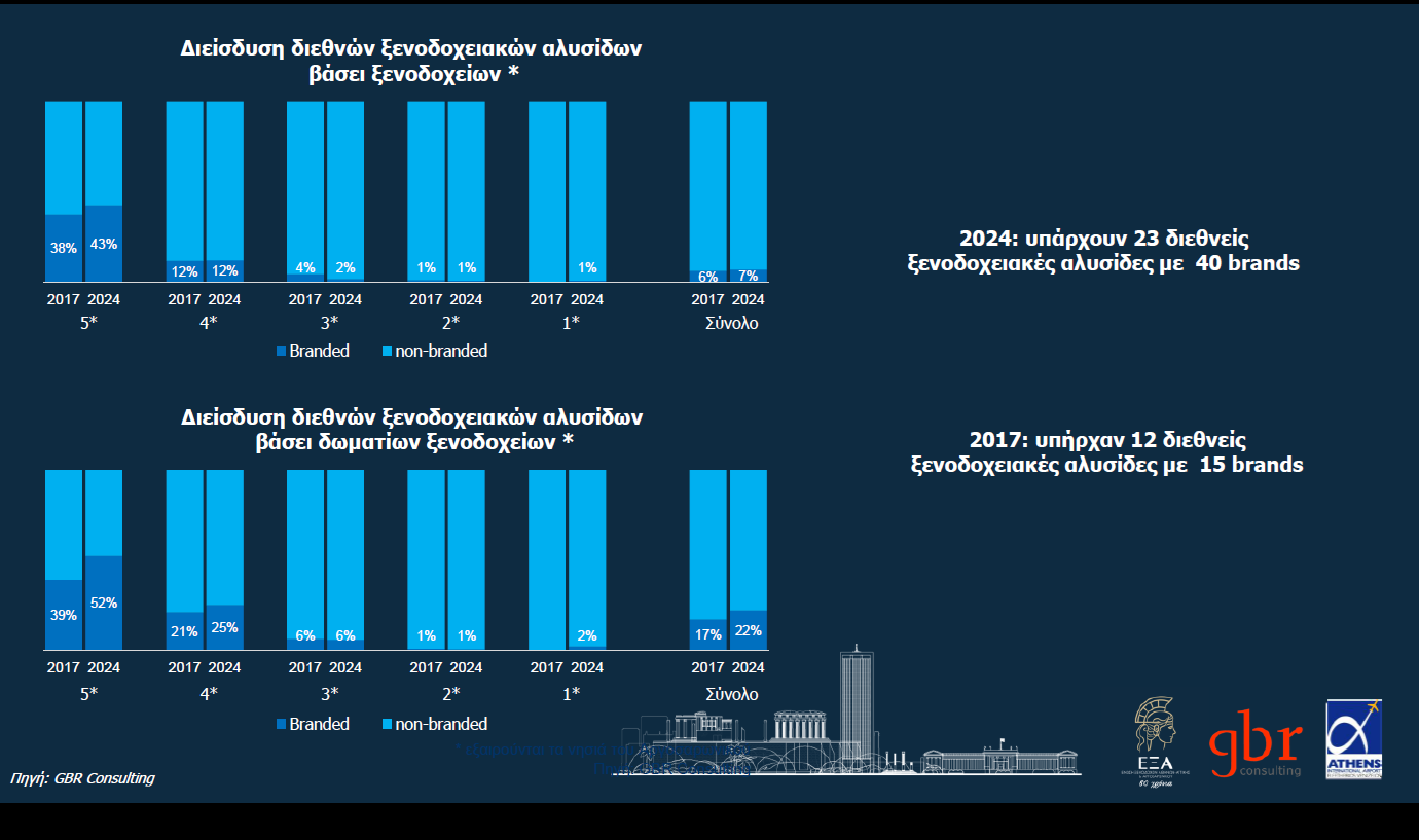 Από το 2017, 11 επιπλέον διεθνείς ξενοδοχειακές αλυσίδες εισήλθαν στην Αττική, αυξάνοντας τον συνολικό αριθμό σε 23 αλυσίδες που διαχειρίζονται 40 brands το 2024. Η διείσδυση των διεθνών brands παραμένει ισχυρότερη στην κατηγορία των 5 αστέρων, όπου το 43% των ξενοδοχείων και το 52% των δωματίων τους ανήκουν σε διεθνή αλυσίδα. Στην κατηγορία των 4 αστέρων, τα αντίστοιχα ποσοστά ανέρχονται σε 12% και 25%.