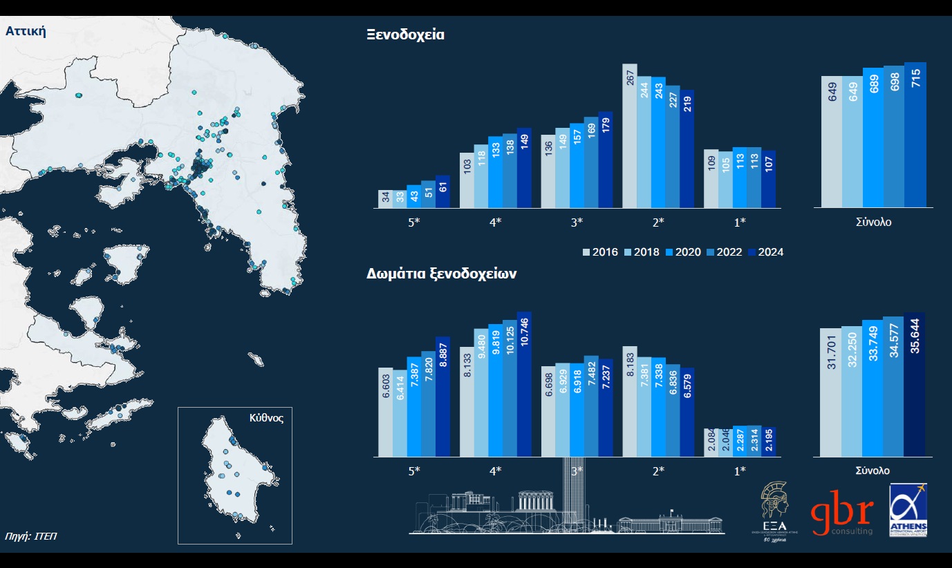 Παρά την αυξημένη ζήτηση, τα ποσοστά πληρότητας των αθηναϊκών ξενοδοχείων δεν παρουσίασαν σημαντική άνοδο. Μεταξύ 2023 και 2024 ο αριθμός των δωματίων ξενοδοχείων αυξήθηκε κατά 3% στην Αττική και 4% στο κέντρο της Αθήνας και η ανάπτυξη αυτή αφορούσε κυρίως τα ξενοδοχεία 3 έως 5 αστέρων, ενώ τα ξενοδοχεία 1 και 2 αστέρων συνέχισαν να μειώνονται.